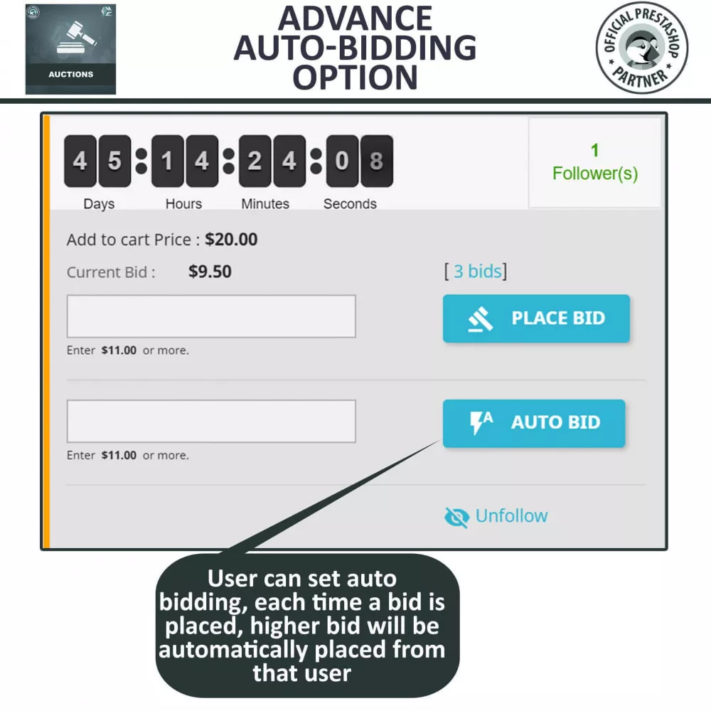 ماژول مزایده پرستاشاپ ، ماژول مناقصه، مزایده و حراج پرستاشاپ به فروشندگان امکان فروش محصولات در قالب مزایده را می دهد. به مشتری اجازه دهید برای خرید یک محصول چندین پیشنهاد قیمتی ارائه دهد و از طریق هشدارهای ایمیل از پیشنهادهای جدید سایر مشتریان آگاه شود. رقابت را بین پیشنهاد دهندگان ایجاد کنید و محصول بهتر و با قیمت بالاتر بفروشید. با این ماژول پرستاشاپ سبک نوینی از تجارت را به فروشگاه خود اضافه کنید.